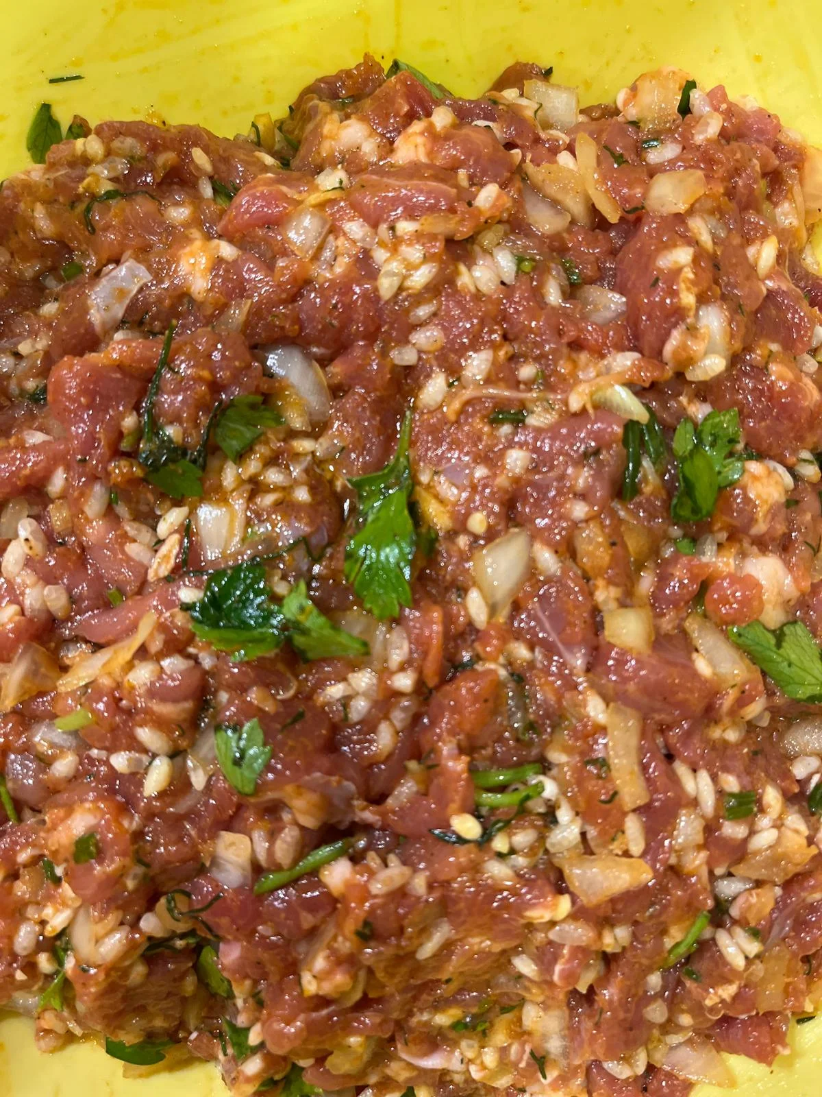 - Lahanaların iç harcı için pirinç, dereotu, maydanoz, sarımsak, soğan, zeytinyağı, kimyon, köri, karabiber, domates salçası, tuz ve kuzu eti bir kasede yoğrulur.