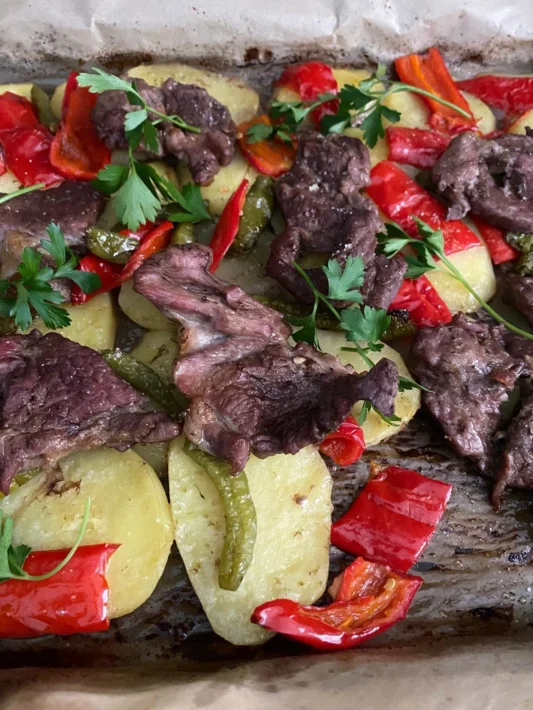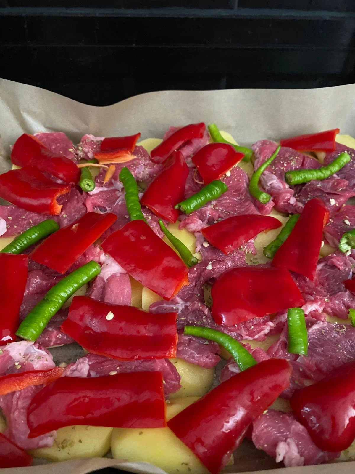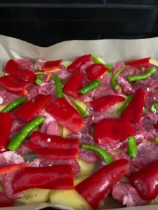 2- Tepsiye yağlı kağıt serilir. Zeytinyağı yağlı kağıt üzerine dökülür. Ardından patatesler tepsiye dizilir, üzerine tuz serpilir. Kuzu külbastılar yerleştirilir, üzerine tuz ve kekik serpilir. Sonra biberler tepsiye koyulur.