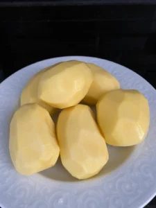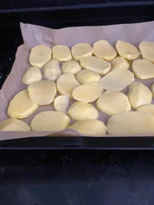 1- Patateslerin kabukları soyulur ve yıkanır. Sonra ince dilimler halinde enlemesine kesilir. Biberler yıkanıp doğranır.