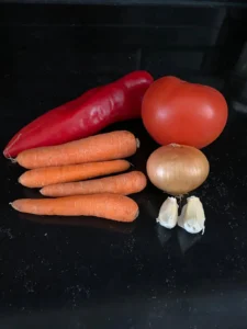 2- Tencereye zeytinyağı, doğranmış soğan, sarımsak, kapya biber, domates, rendelenmiş havuç konulur. Ocağa alınır. 5 dakika karıştırılarak pişirilir.