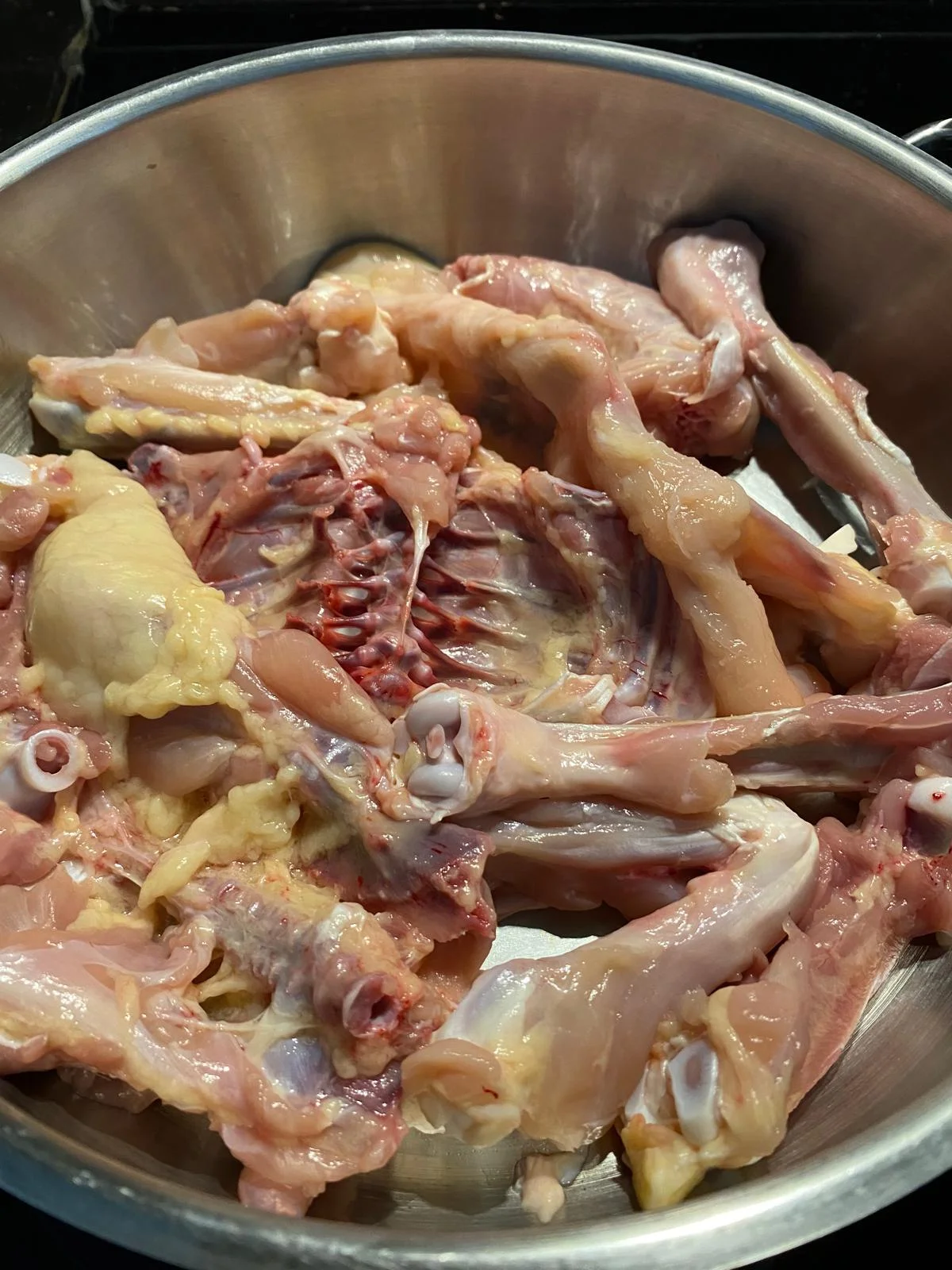 1- Bütün tavuk parçalara ayrılır. Tavuk eti kemiklerden sıyrılır.